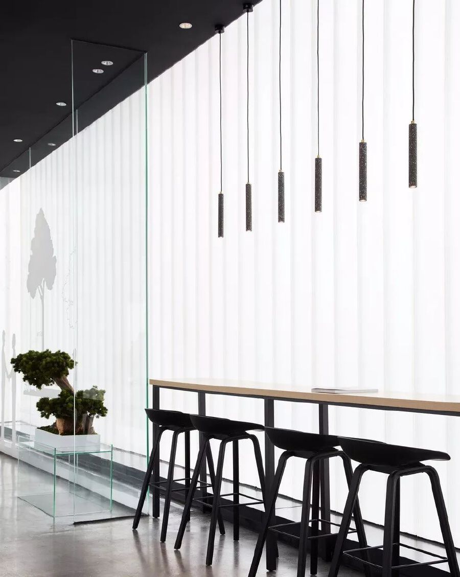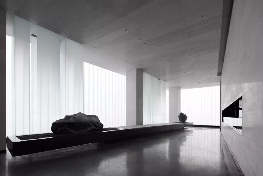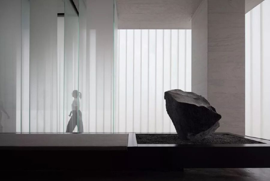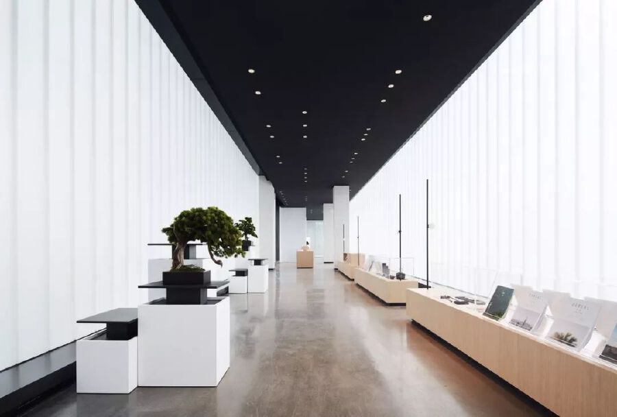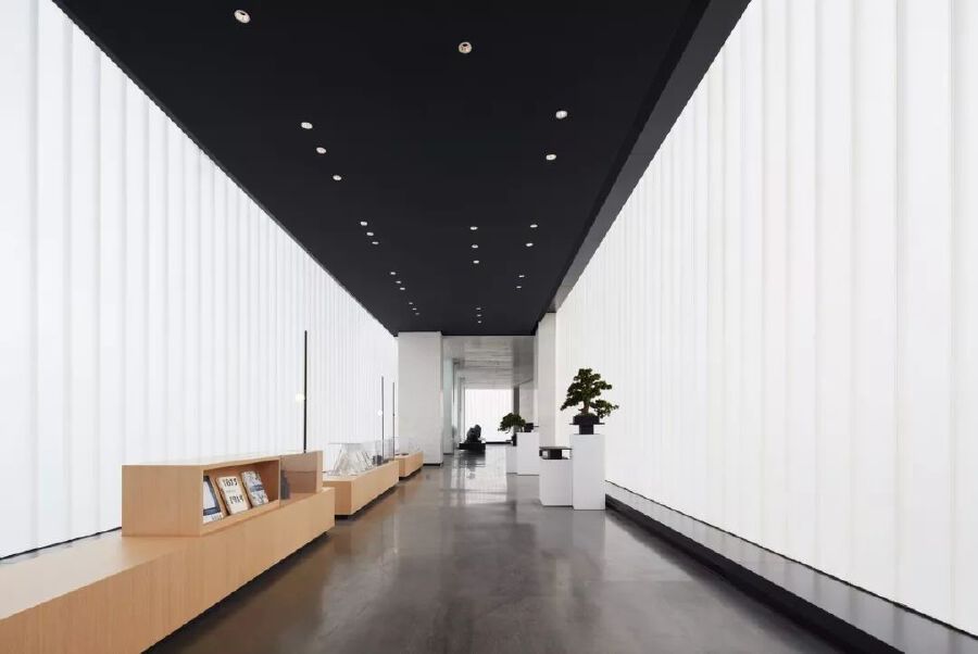 從室內(nèi)空間關(guān)系的層面,白是一個(gè)基礎(chǔ),是規(guī)矩;黑是變化身形、恣意流動(dòng)或瞬爾駐足,不逾矩的姿態(tài)。兩者所呈現(xiàn)的形式,于音樂的層面,構(gòu)建出帶有即興撩弦,音能動(dòng)人的意味。中國(guó)的雅樂,琴為大音,大音希聲。希聲者,正在有無(wú)之間。富象征意義的黑白通過大幅度玻璃與戶外的環(huán)境達(dá)成銜接,視覺引導(dǎo)心境,在“虛實(shí)”、“有無(wú)”間輕盈穿越。