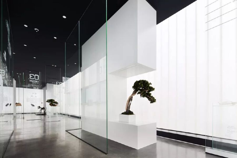 空間的大體色調(diào)最終確定為黑白。不過與司空見慣,以黑白顯“酷”的思路毫無(wú)沾染。而是意念上取“天地乾坤”,表現(xiàn)層面取“白紙濡墨”。因此在呈現(xiàn)的姿態(tài)上,并不作富視覺沖擊力的切割,不刺激眼球,而是將空間呈山水手卷般舒緩的逐次展開。