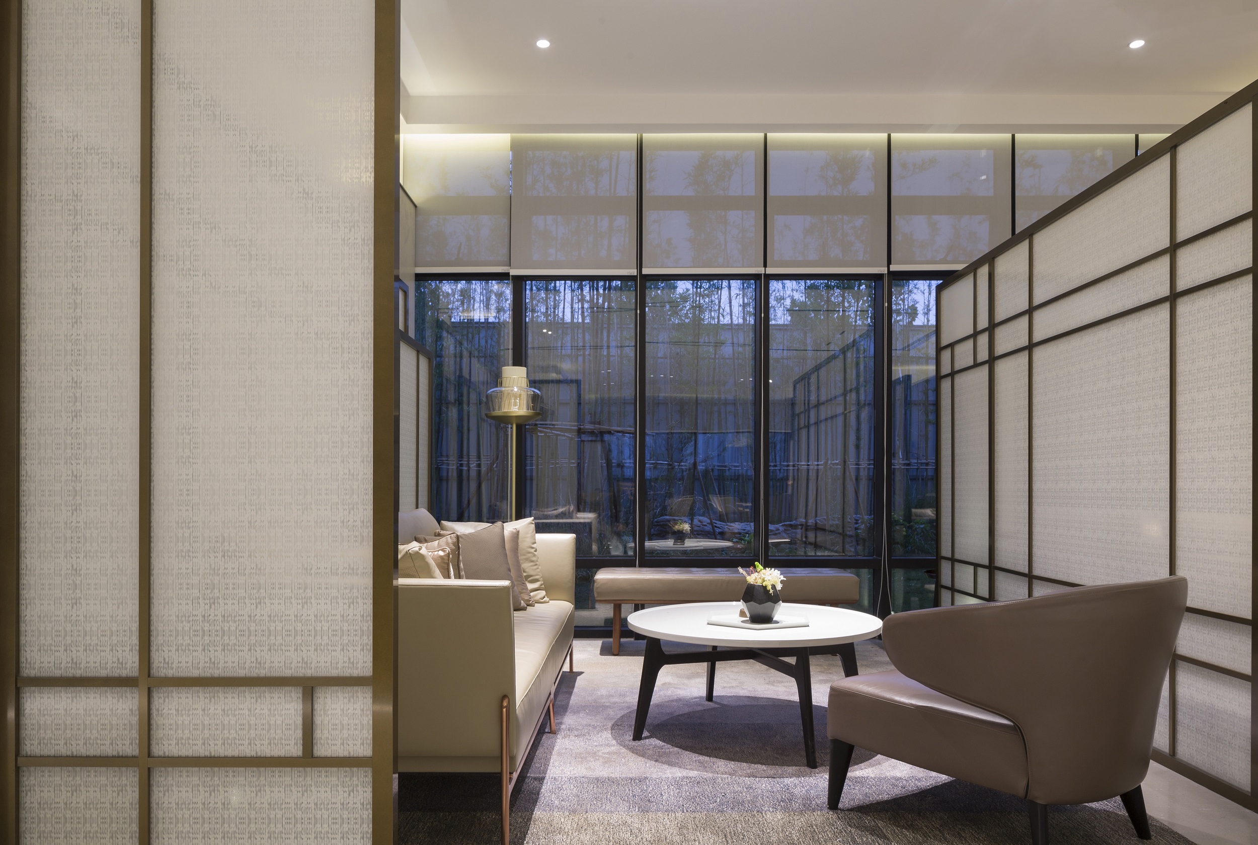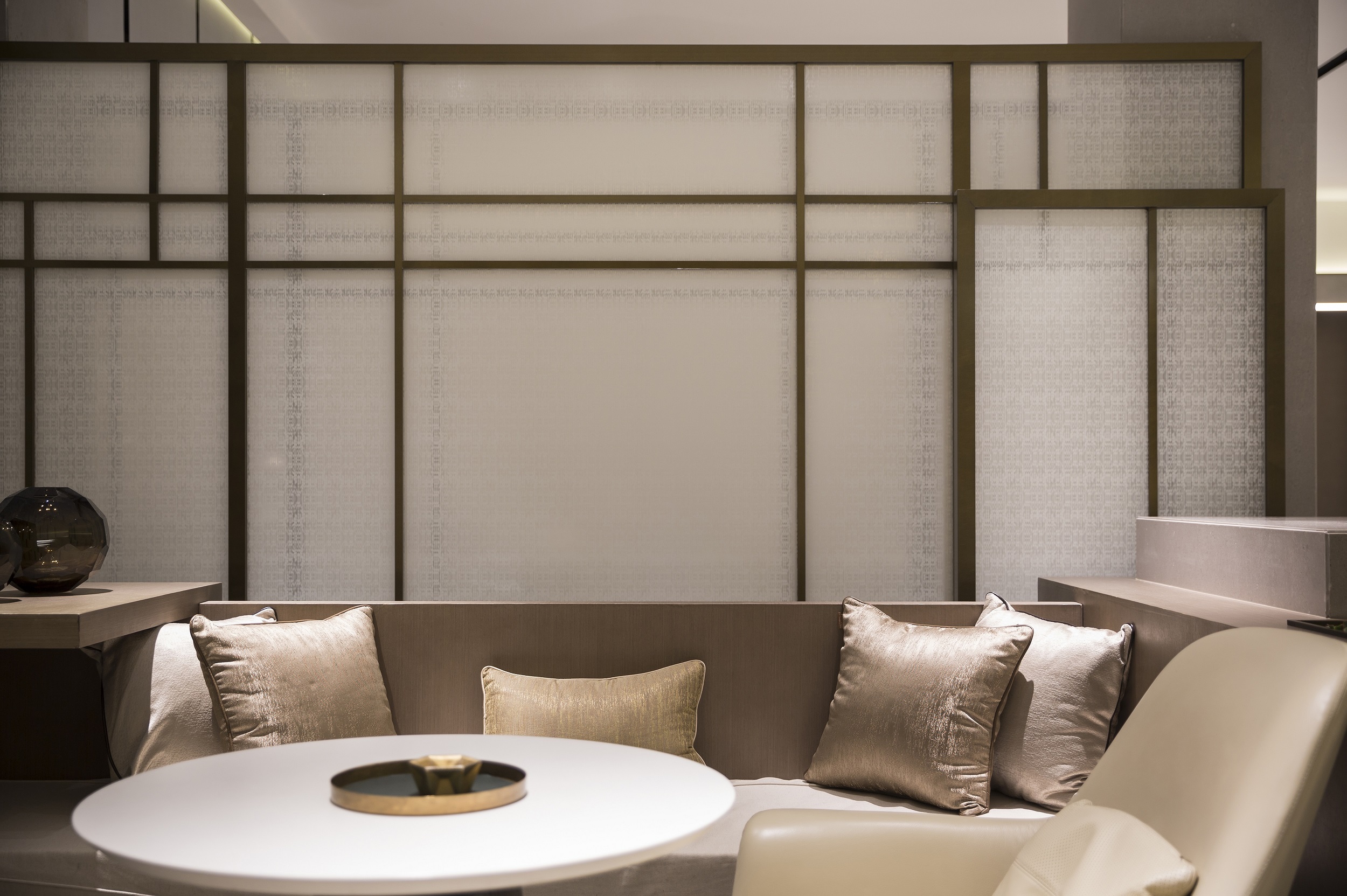 半通透的夾絲玻璃的巧妙運(yùn)用,使間隔開(kāi)的洽談區(qū)域在視覺(jué)上依然是一個(gè)整體,借助視線的隱約,感知空間的隱喻,萌生溫暖的向往。